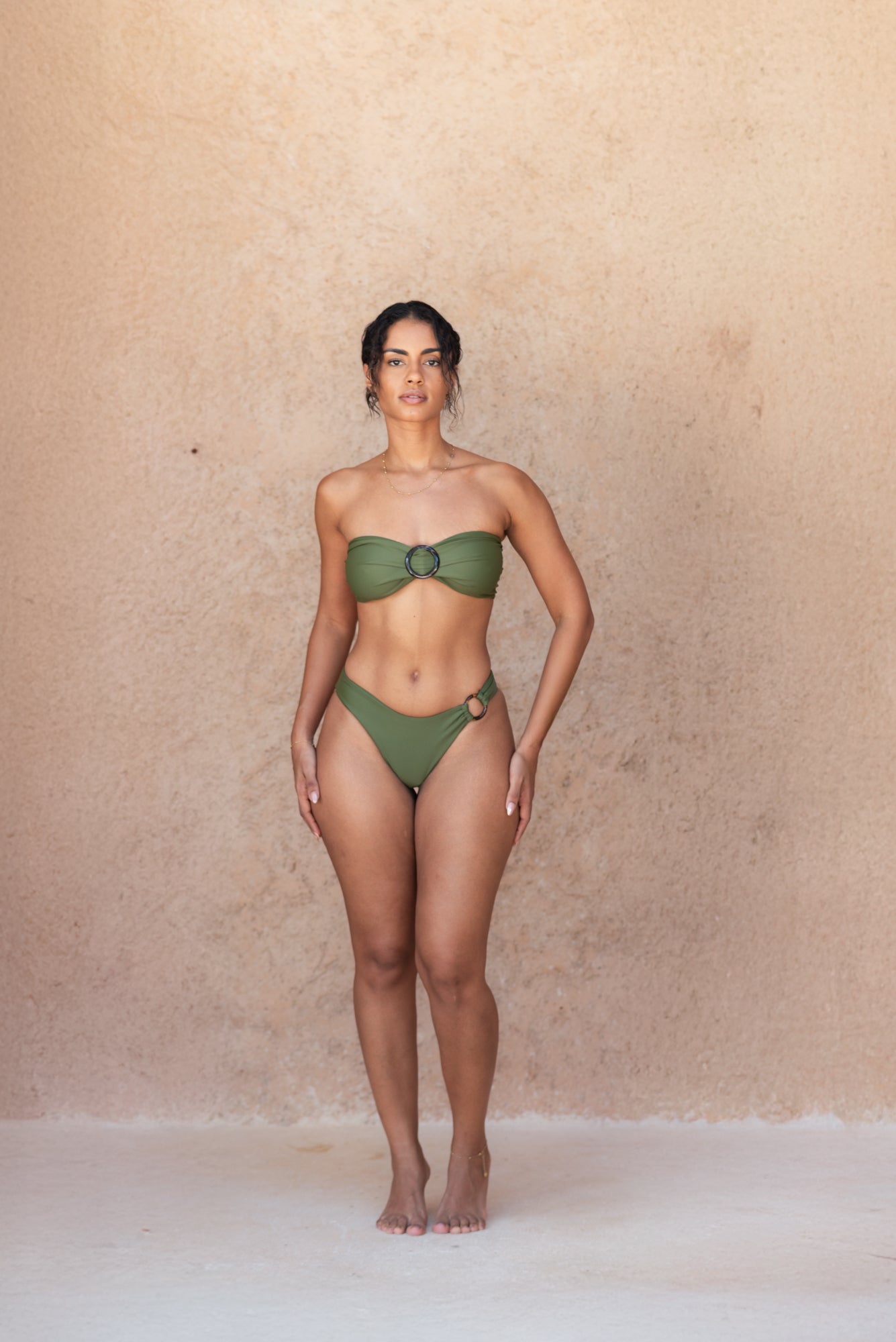 This tanga bottom features a modern, low-rise and sleek cut, ideal for minimizing tan lines. Adorned with a small ring on the side, signature of our NOMAD collection, it's perfect for those who want to show a bit more skin.