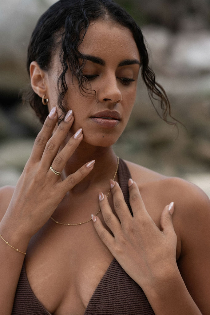 Notre haut triangle le plus audacieux, conçu pour celles qui aiment oser. Avec sa silhouette minimaliste et ses petits anneaux, signature de notre collection NOMAD, il offre une coupe sexy et ajustable qui s'adapte parfaitement à votre corps grâce à ses bretelles nouées au cou et au dos.